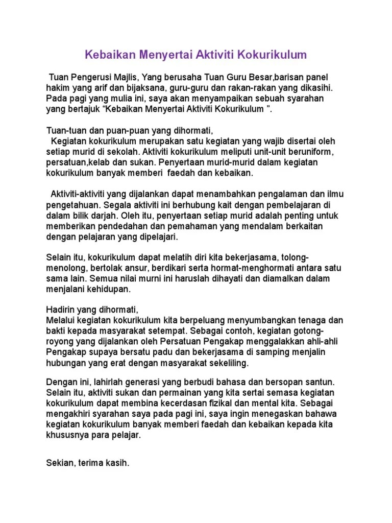 Contoh ulasan faedah menyertai aktiviti kokurikulum. Kebiasaannya aktiviti kokurikulum diadakan pada sebelah petang atau hujung minggu. Semua pelajar digalakkan menyertai kegiatan kokurikulum kerana kegiatan ini mempunyai banyak. Ulasan faedah menyertai aktiviti kokurikulum.
